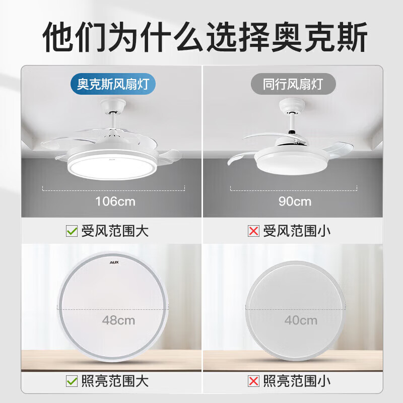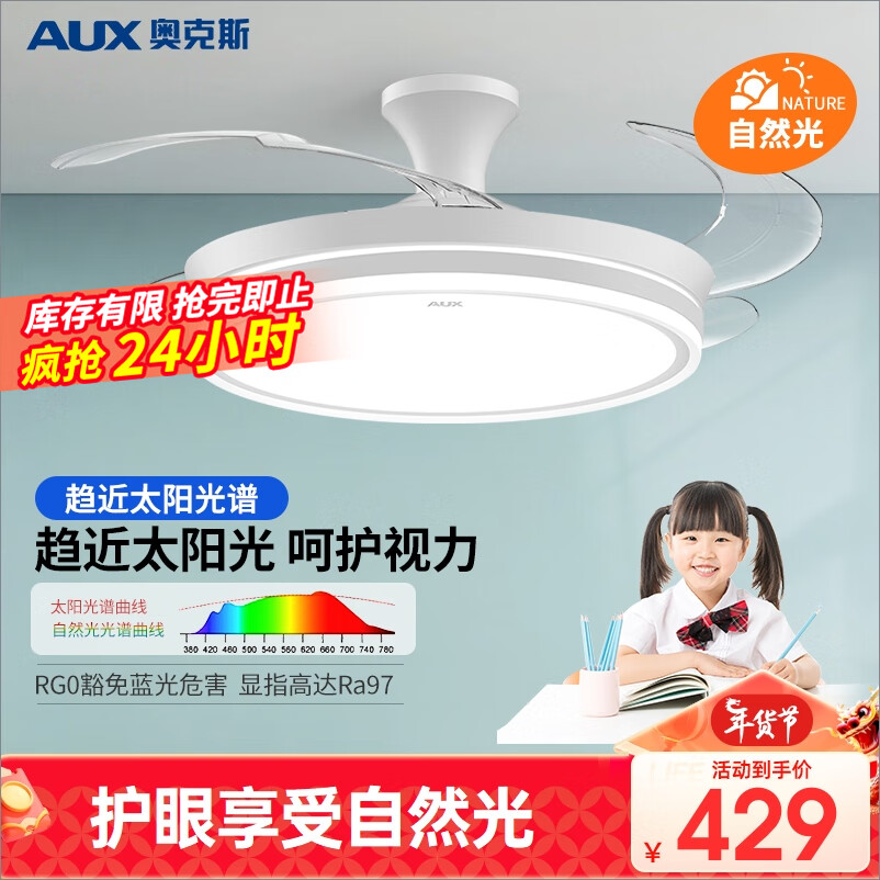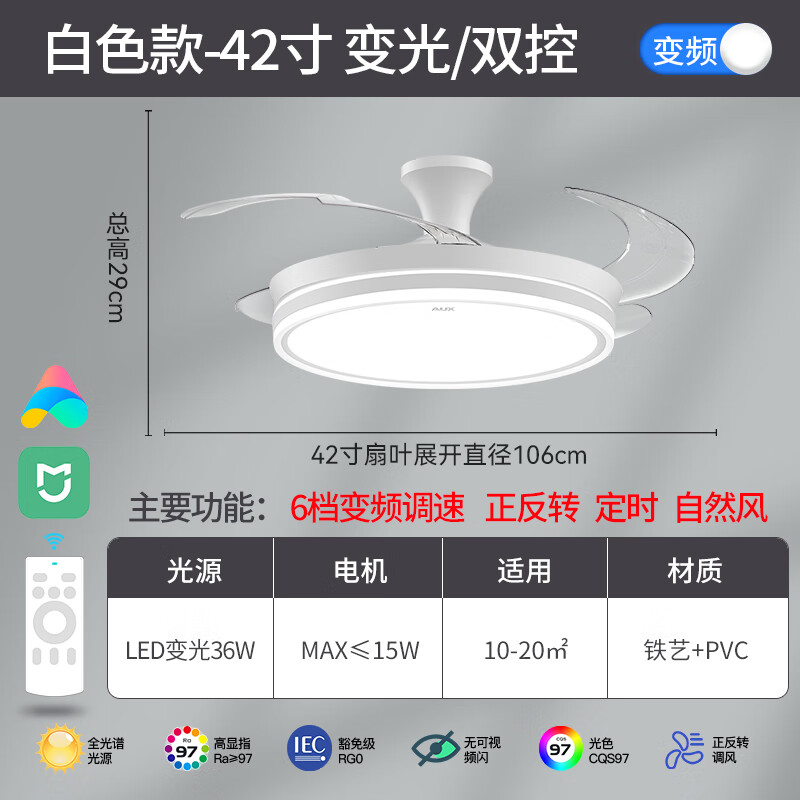 奥克斯(AUX)风扇灯2023隐形吊扇灯家用一体吊灯餐厅42寸米家智能ra97光源价格:715.00元!