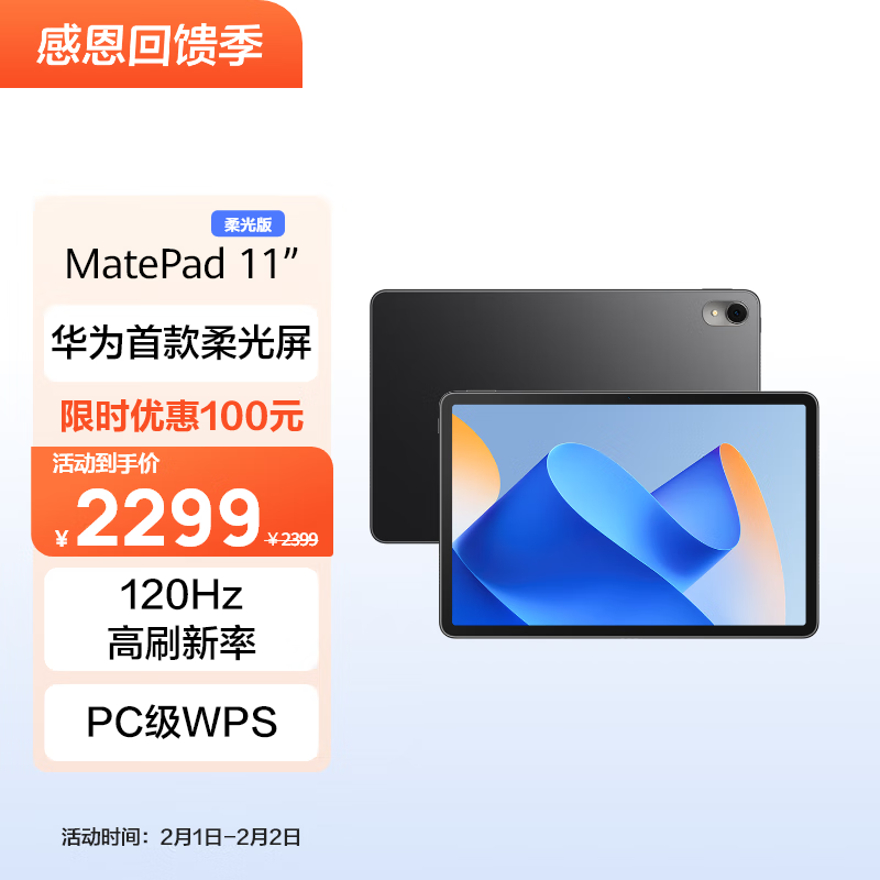 HUAWEI MatePad 11英寸2023款柔光版华为平板电脑120Hz高刷2.5K护眼屏娱乐学习 8+128GB WIFI曜石黑价格:2299.00元!
