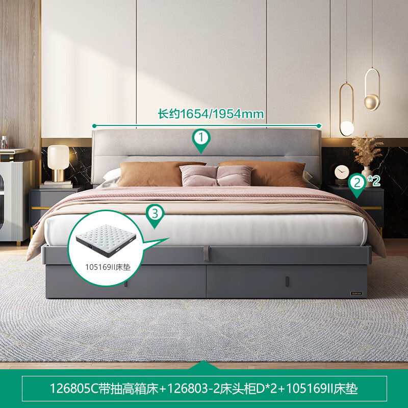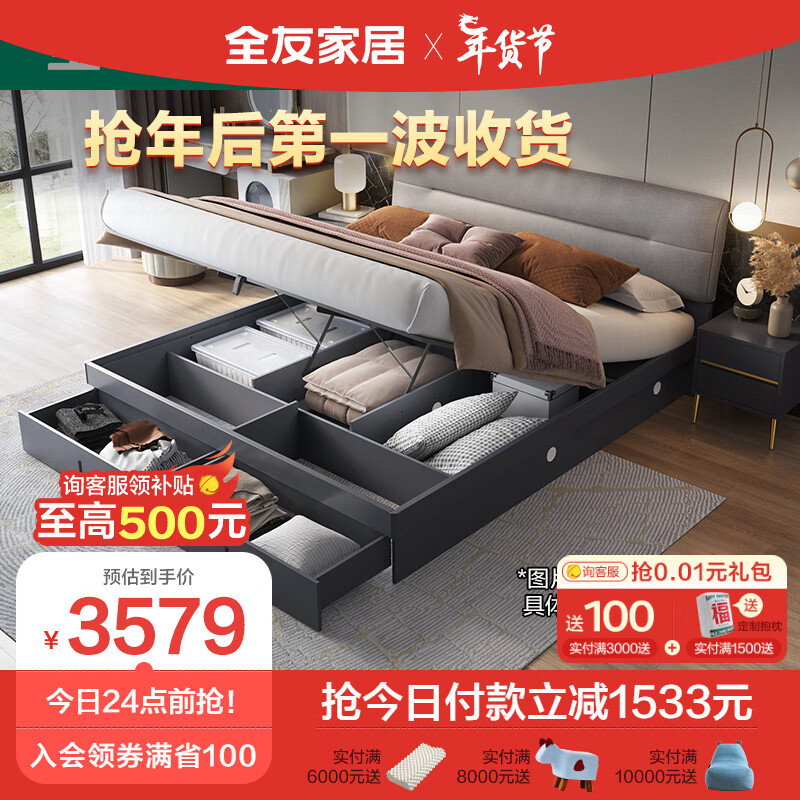 全友家居 意式轻奢卧室科技布软包床屏高箱储物床126805价格:5112.86元!