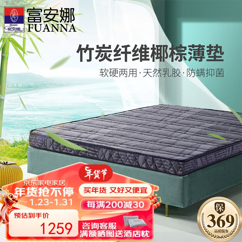 富安娜床垫 竹炭椰棕床垫抑菌防螨天然乳胶床垫偏硬双面可用床垫1.8*2米价格:1469.00元!