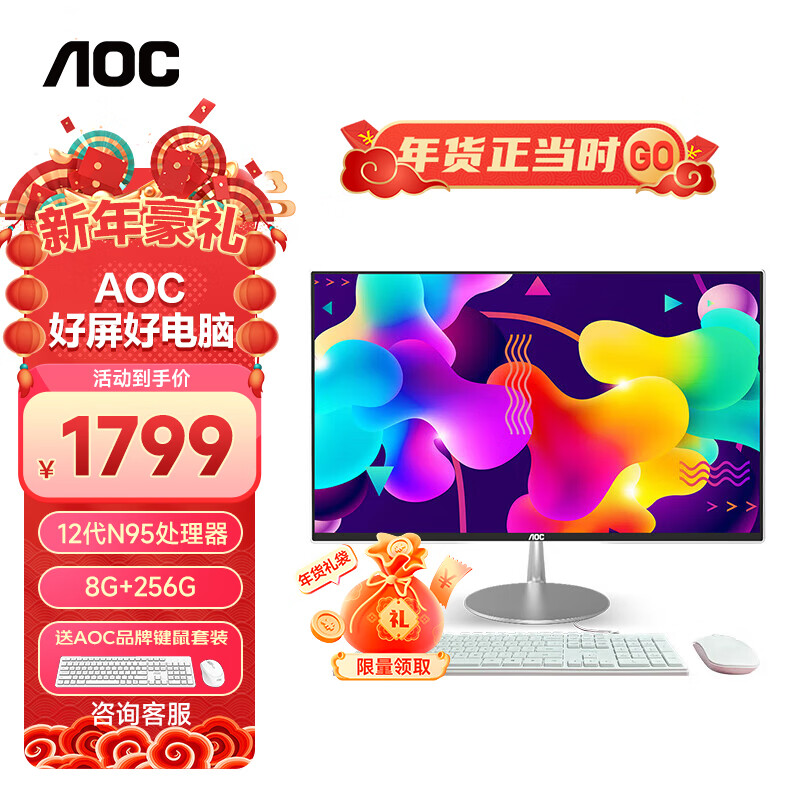 AOC美人鱼734 23.8英寸高清家用办公一体机电脑台式(12代N95 8G 256G 双频WiFi 无线键鼠 3年上门)白价格:1799.00元!
