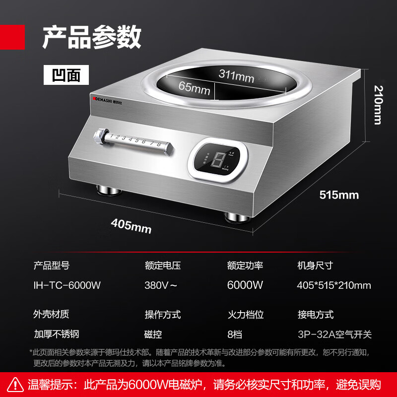 德玛仕(DEMASHI)电磁炉大功率商用6000W 凹面电磁炉6000瓦磁控电磁灶全不锈钢凹形电池炉IH-TC-6000W【380V】价格:1699.00元!