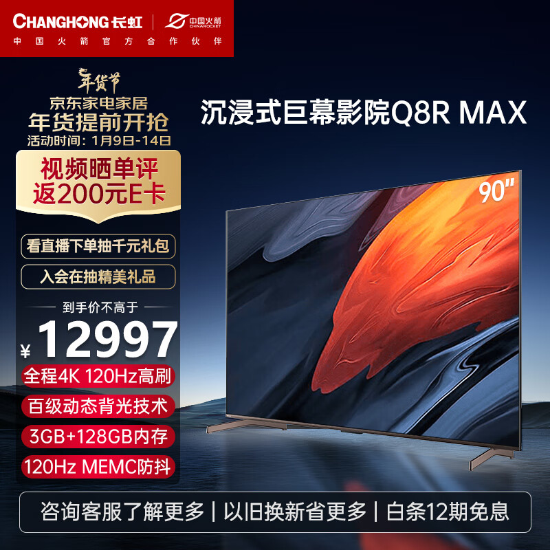 长虹CHiQ电视90Q8R MAX?90英寸全程120Hz 分区背光 杜比音画?3+128GB超大存储?智能平板液晶LED电视机价格:12997.00元!