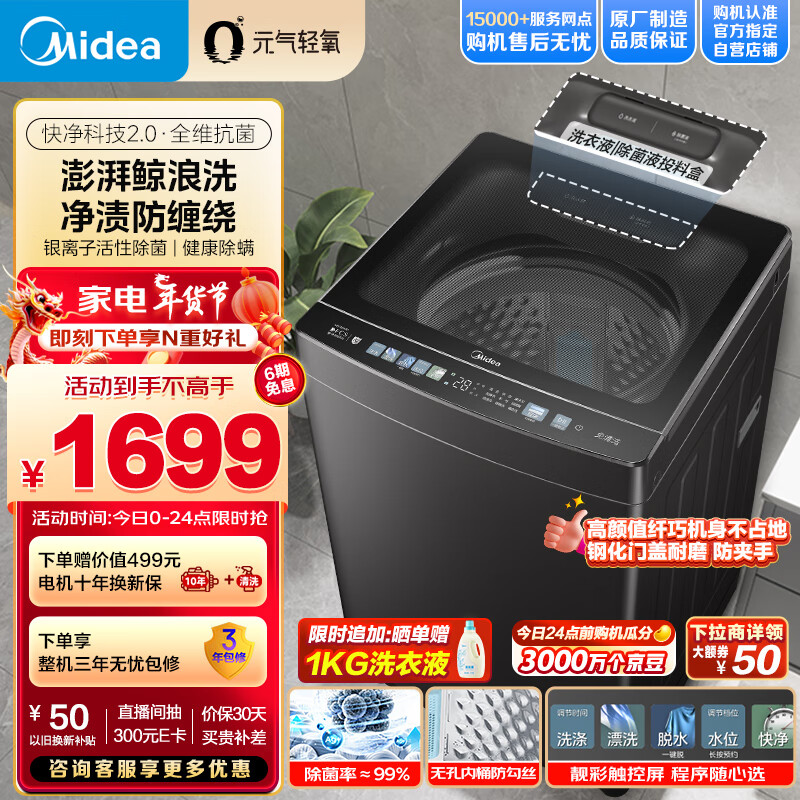 美的(Midea)波轮洗衣机全自动 元气轻氧系列 10公斤 快净科技 澎湃鲸浪洗 银离子除菌 健康除螨 MB100AIR1价格:1699.00元!