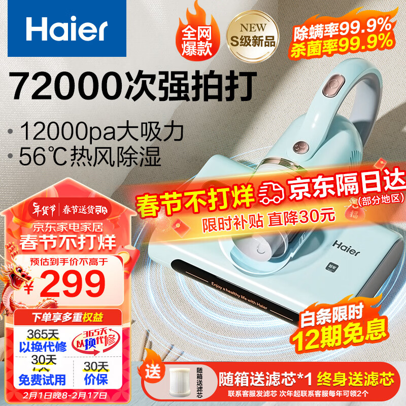 海尔萌宠除螨仪家用床上吸尘器 大吸力除螨 UV-C紫外线杀菌双仓超声波 热风除湿吸尘神器CM1E价格:299.00元!