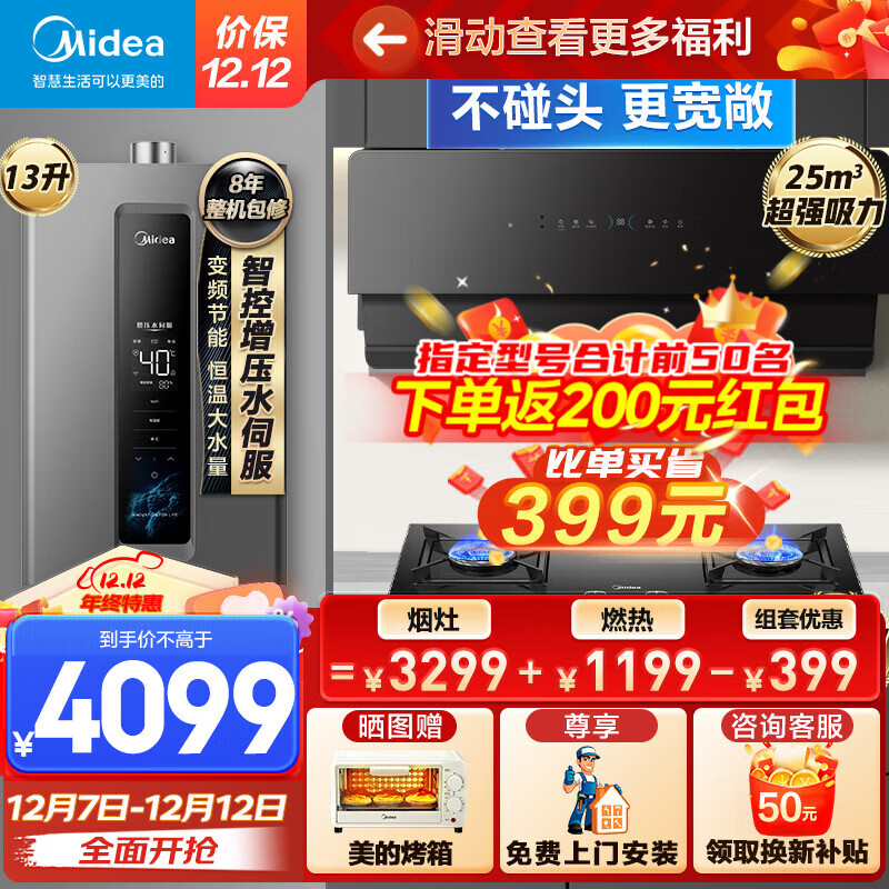 美的(Midea)侧吸抽油烟机灶具烟灶多件套装燃气热水器家用烟灶燃热厨房三件套JA7+Q330+13RF3天然气价格:4099.00元!