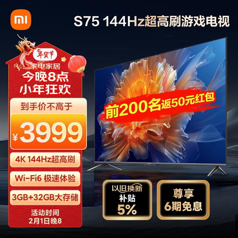 小米S75 75英寸4K 144Hz超高刷全速旗舰游戏电视 WiFi 6 3GB+32GB金属屏智能电视L75M9-S以旧换新价格:3849.00元!