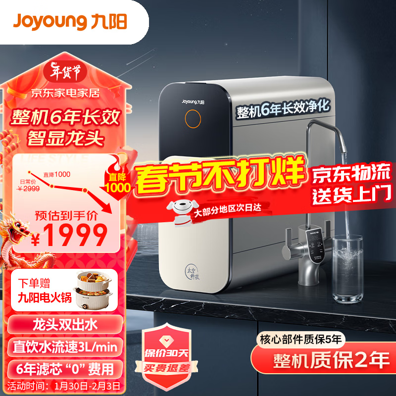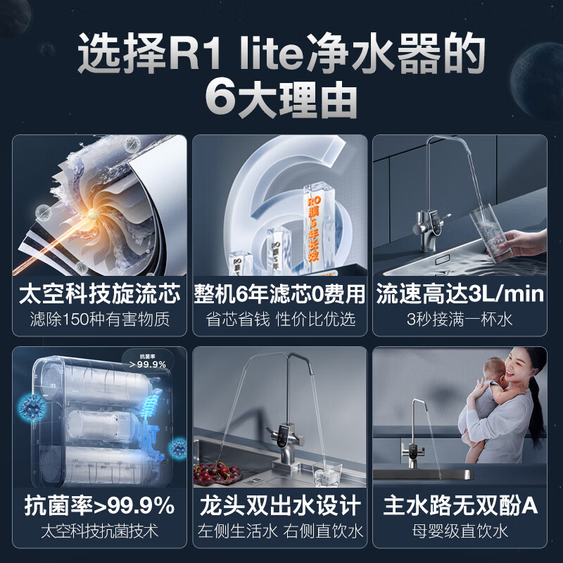 九阳净水器家用净水机R1 lite-1000G 6年长效RO反渗透双出水厨下式净水器直饮机 双TDS数显大通量3L/分价格:1999.00元!