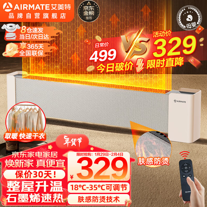 艾美特(AIRMATE)【日光温室】取暖器/电暖器/电暖气片家用石墨烯地暖母婴级肤感防烫踢脚线 【石墨烯速热+肤感防烫遥控款】母婴级专用R37价格:329.00元!