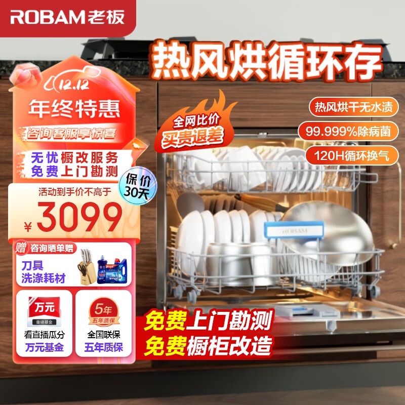 老板(Robam)WB781XH 10套大容量嵌入式洗碗洗锅机热风烘干消杀长效循环存储一体机家用中式搁架快速洗价格:3099.00元!