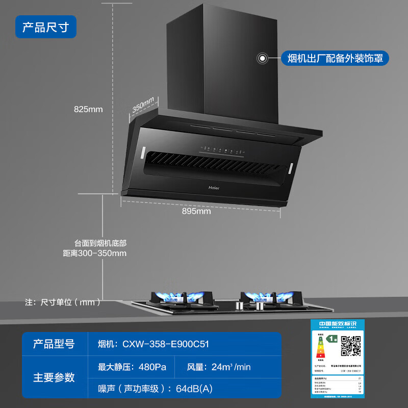 海尔(Haier)抽油烟机 顶侧双吸 7字型家用排烟机 24m3/min大吸力 齐平橱柜 挥手智控 自动清洗排吸烟机C51价格:1899.00元!