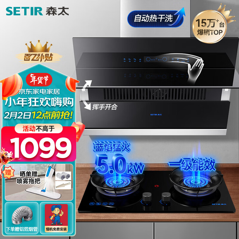 森太(SETIR)B560QC抽油烟机侧吸式脱排自动清洗吸油烟机大吸力家用抽烟机 【烟灶套装】搭配5.0kW聚能灶-液化气 25立方爆吸风量价格:1099.00元!