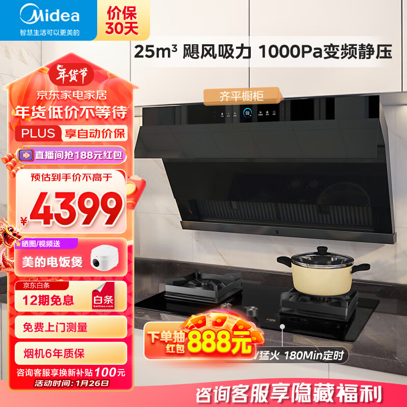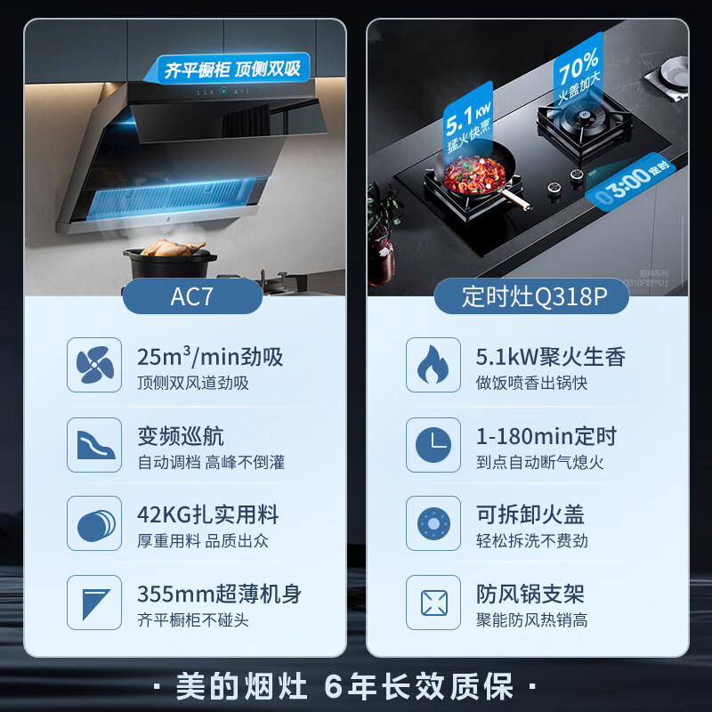 美的(Midea)抽油烟机灶具套装 顶侧双吸油烟机家用25风量智能巡航超薄双吸烟灶套装AC7+Q318P天然气套装价格:4399.00元!
