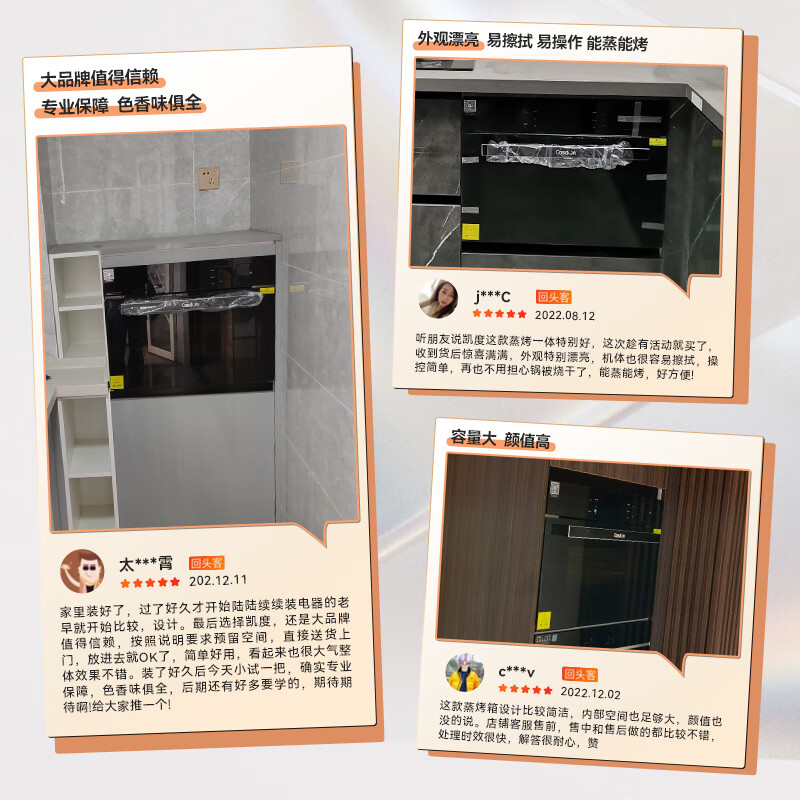 3、凯度这款蒸烤鸡还是不错的,颜值很高,功能强大,美中不足如果有个微波炉的功能就更好了^0^~^0^~^0^~,商家让我自己安装,也非常容易安装,推进去就可以了