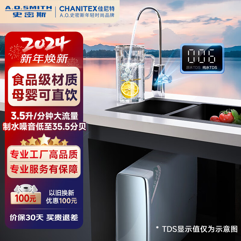 史密斯(A.O.SMITH)佳尼特蓝鲸净水器家用厨下式直饮净水机3.5升/分钟专利MAX5.0反渗透 0陈水 CR3500AB1 以旧换新价格:4299.00元!