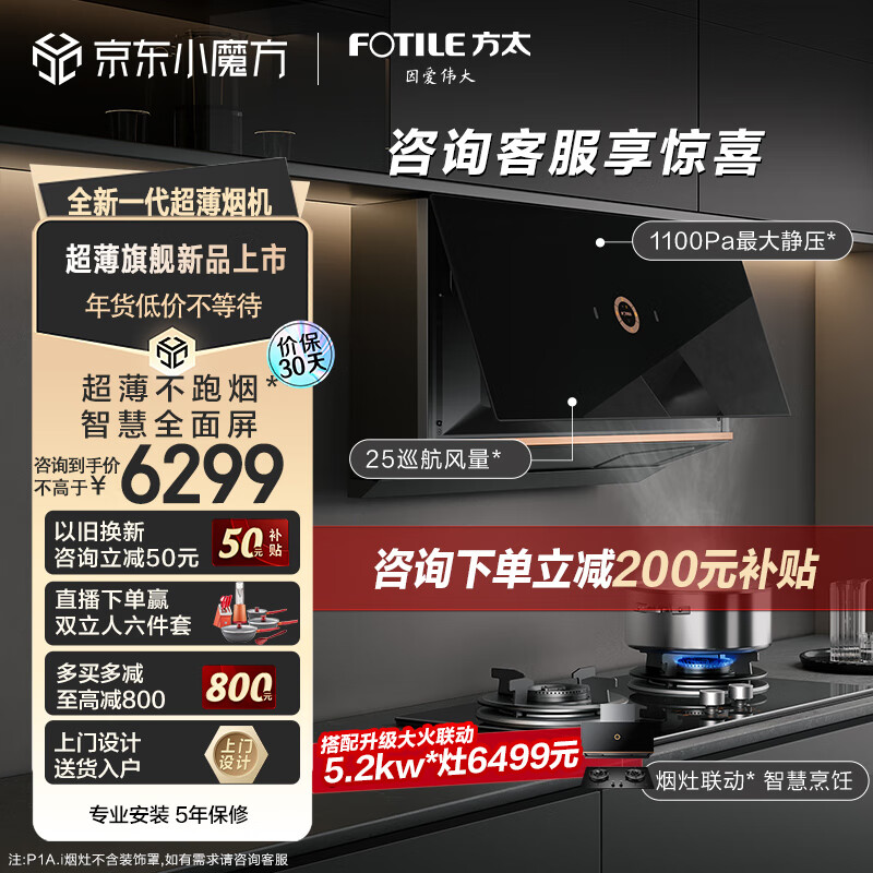 方太(FOTILE)抽吸油烟机灶具套装 侧吸式变频套装 25大风量 超薄近吸 烟灶联动 燃气猛火双灶 P1A.i+THF1A-厂送价格:6299.00元!