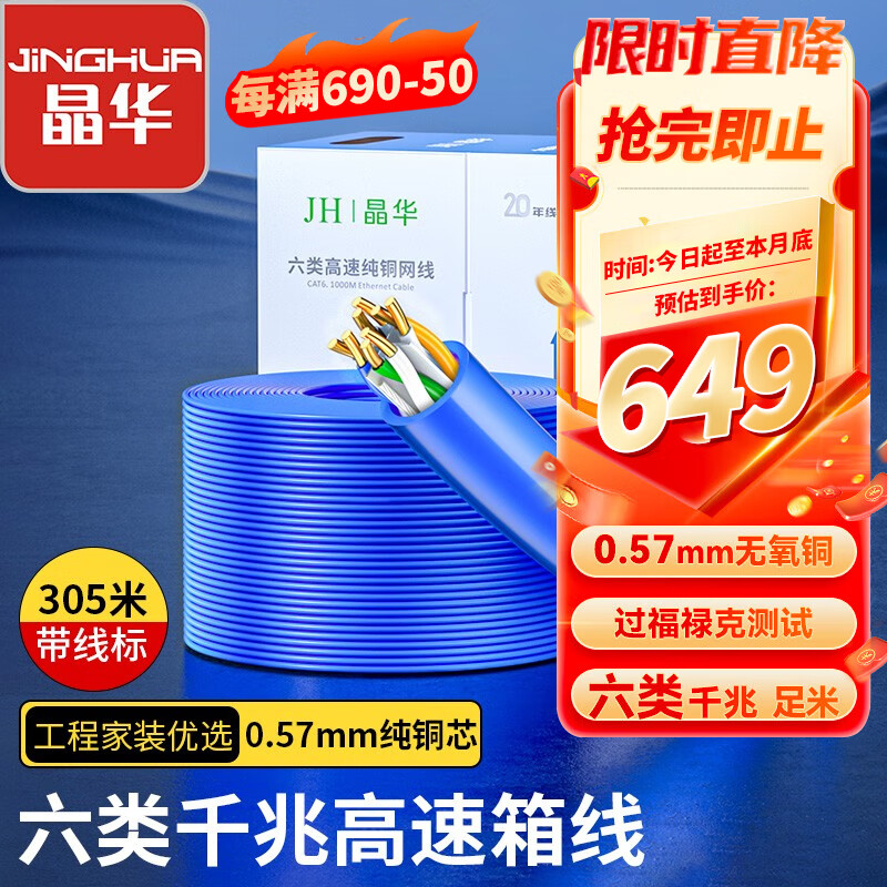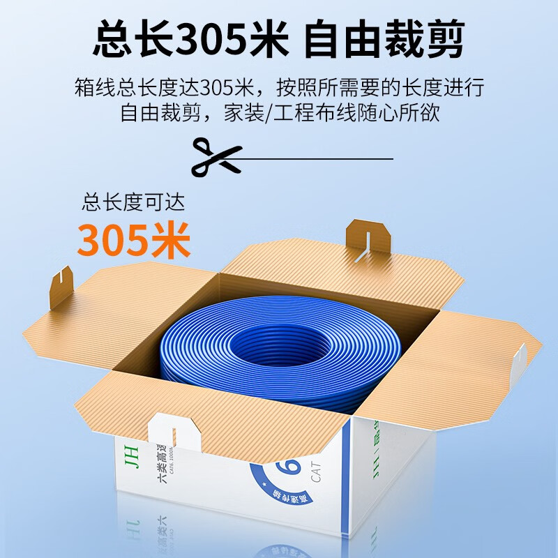 晶华 六类千兆网线【工程版0.57mm纯铜线芯】CAT6类非屏蔽线双绞线 家装网络布线监控箱线 蓝色305米 P616Y价格:699.00元!