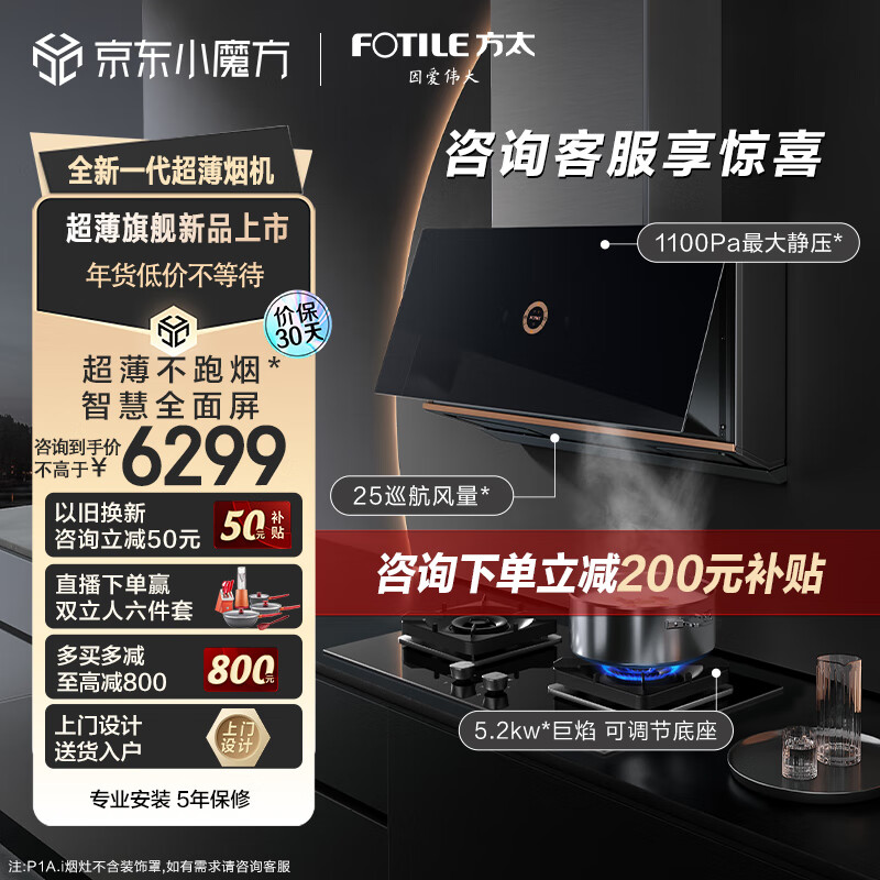方太抽吸油烟机灶具套装 侧吸式变频烟灶 25大风量 超薄近吸 5.2kW燃气猛火双灶 P1A.i+02-TH27B价格:6299.00元!