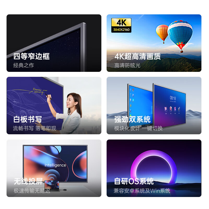 1、外形外观:设计很人性化,笔就在后面吸住,找起来很方便屏幕音效:音效,屏幕显示,会议功能都很好用,功能多样,可以当白板用也可以当电视用安装同步:师傅下着大雨来给安装的,很不错