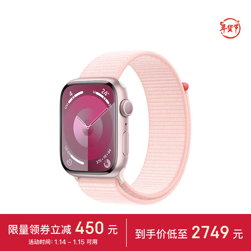 Apple/苹果 Watch Series 9 智能手表GPS款45毫米粉色铝金属表壳 亮粉色回环式运动表带 健康手表S9 MR9J3CH/A价格:3199.00元!