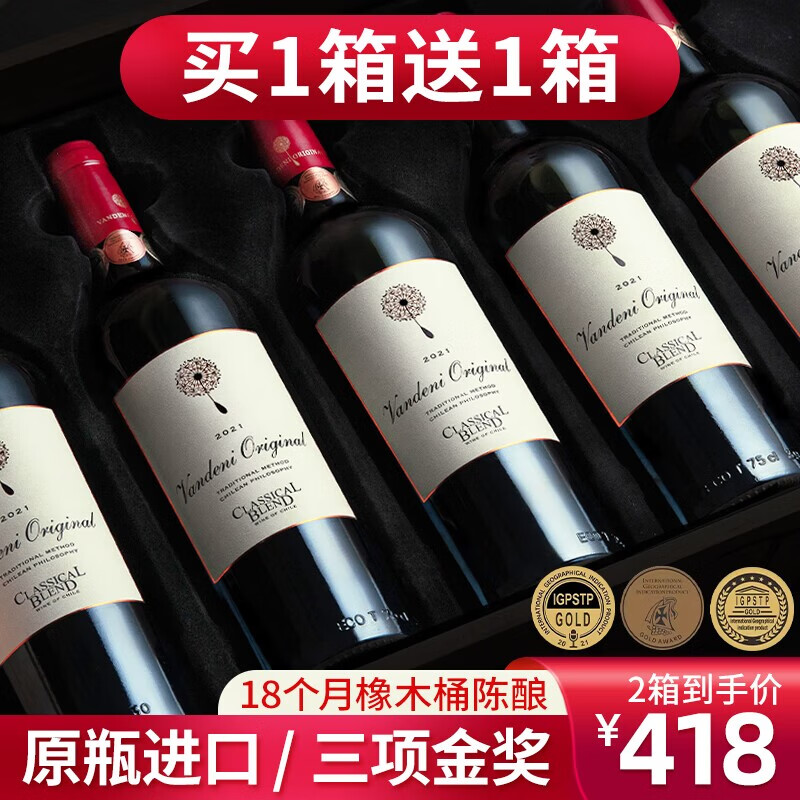 凡登尼【国际3项金奖/共2箱】原瓶进口红酒整箱 智利干红葡萄酒送礼盒装 【中央山谷13.5度】2箱共12瓶价格:488.00元!