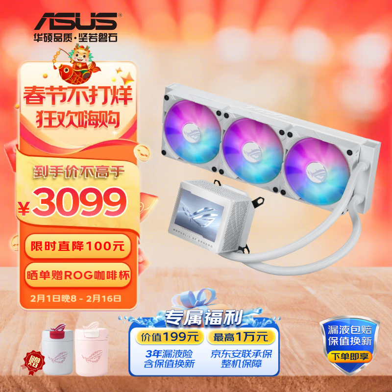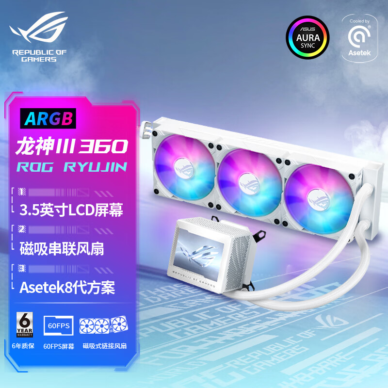 华硕(ASUS)ROG 龙神III代 360ARGB白色一体式水冷散热器 Asetek8代方案/磁吸式风扇/3.5英寸LCD屏/神光同步价格:3099.00元!