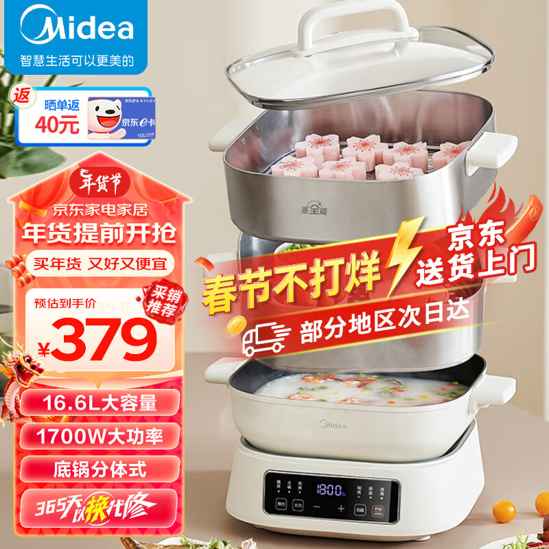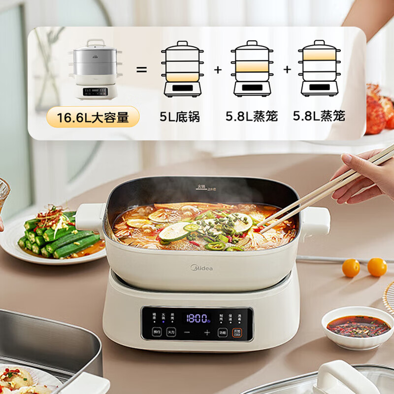 美的(Midea)电蒸锅 电煮锅 电火锅 多功能锅家用电锅蒸包子锅蒸全能三层大容量多用途锅 ZGC282802价格:439.00元!