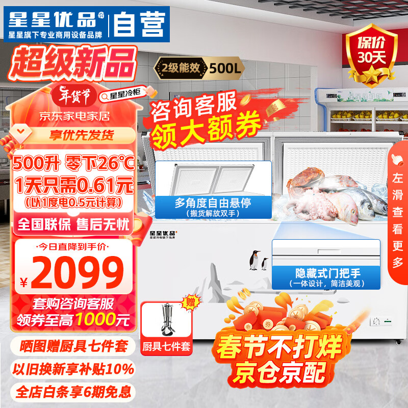 星星 500升卧式冰柜家商用冰柜冷藏保鲜强劲速冻超市大容量冷柜省电款 零下26℃ 高性价比BD/BC-500C/U价格:2099.00元!
