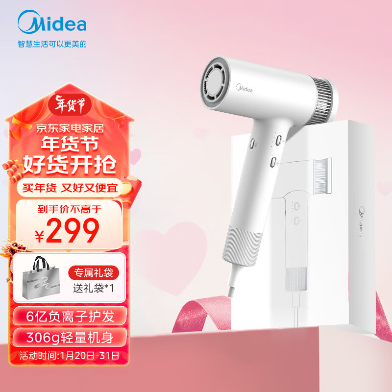 美的(Midea)高速吹风机家用吹风筒大功率/高浓度负离子护发/大风力速干电吹风/节日礼物FG3-流光白价格:329.00元!