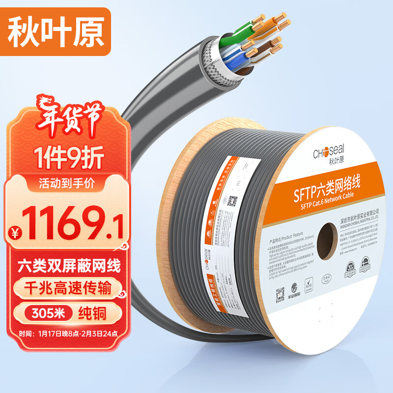 秋叶原(CHOSEAL)六类双屏蔽网线【商用版】CAT6类千兆抗干扰铜线工程家装箱线灰色305米 QS2605AT305价格:1299.00元!