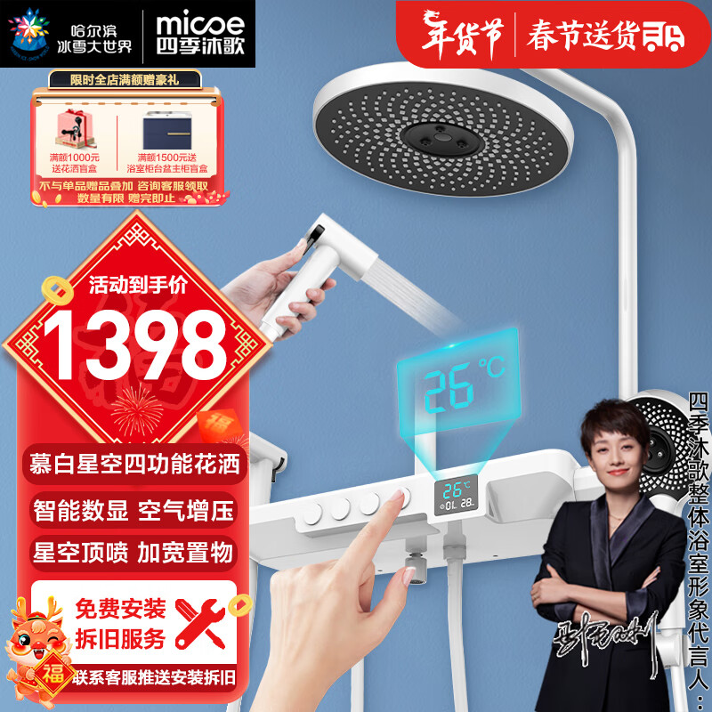 四季沐歌(MICOE)卫浴精铜淋浴花洒增压沐浴花洒喷头顶喷带置物架四功能花洒套装价格:1698.00元!