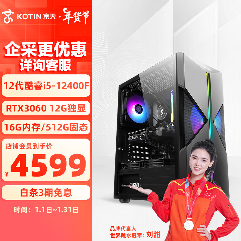 京天 Duel D536 i5-12400F/RTX3060 12G/16G/500G/B660/3年上门台式吃鸡游戏组装电脑整机DIY主机UPC价格:4599.00元!