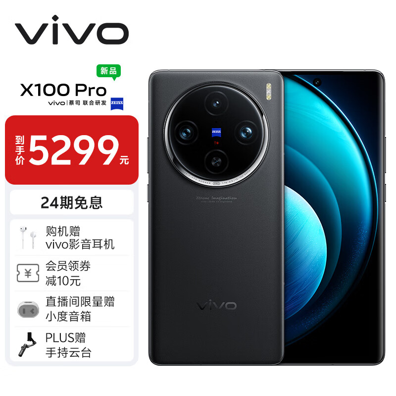 vivo X100 Pro 16GB+256GB 辰夜黑 蔡司APO超级长焦 蓝晶×天玑9300 5400mAh蓝海电池 自研芯片V3 手机价格:5299.00元!