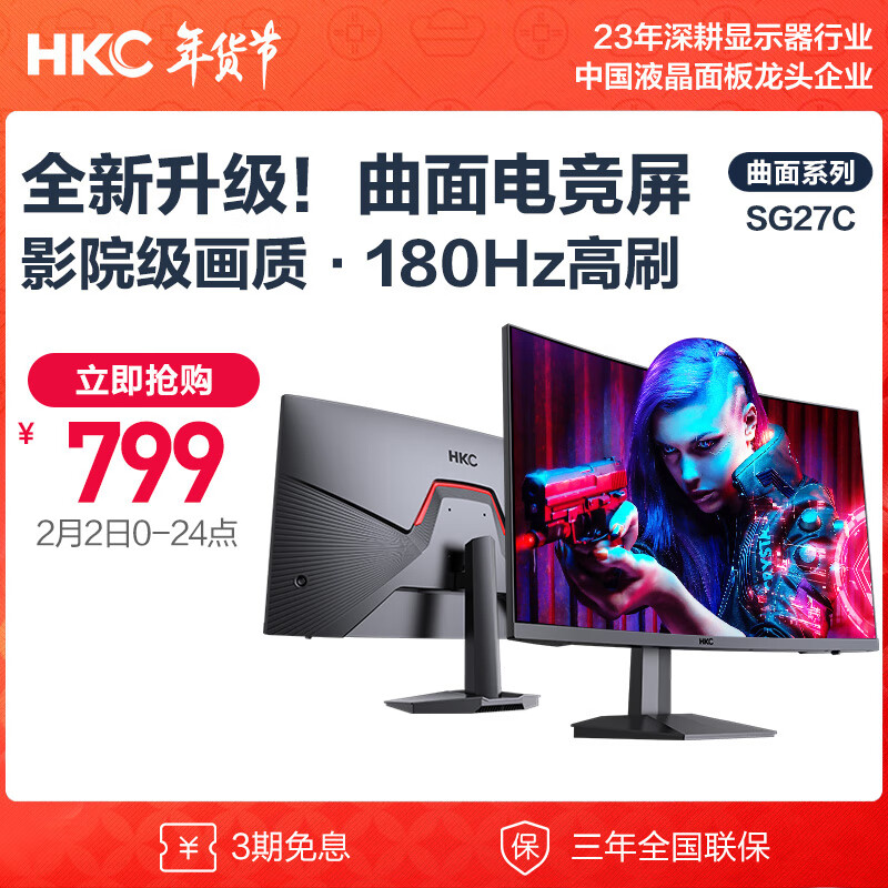 HKC 27英寸高清屏幕180Hz电竞 1500R曲面显示屏 hdmi吃鸡游戏 1080p宽屏台式 不闪屏 显示器 SG27C价格:949.00元!