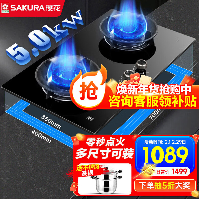 樱花(SAKURA)燃气灶家用嵌入式燃气灶台炉灶具猛火灶家用台式一级能效零秒点火防风聚能炉架 GC01【液化气】5.0KW多开孔尺寸安装价格:1499.00元!