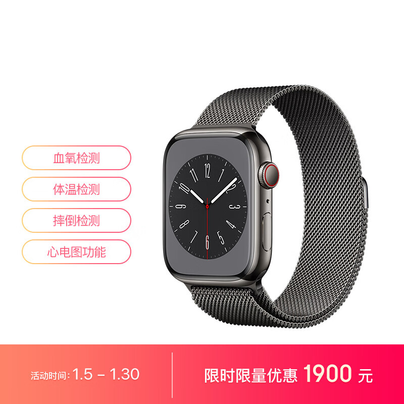 Apple/苹果 Watch Series 8 智能手表GPS+蜂窝款41毫米石墨色不锈钢表壳石墨色米兰尼斯表带eSIM手表 S8 MNJN3CH/A价格:3999.00元!