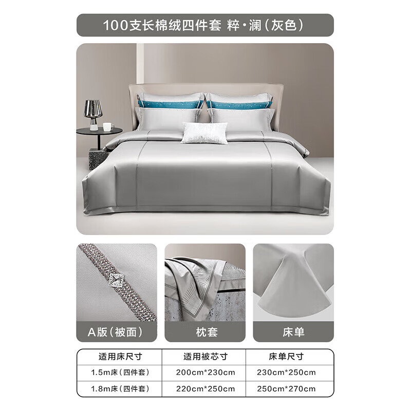 罗莱家纺 纯棉床上四件套床单被套被罩床上用品 粹·澜 灰色 220*250价格:3199.00元!