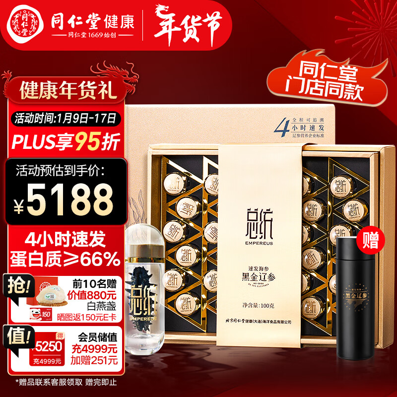 同仁堂(TRT)北京同仁堂大连速发海参辽参100g30只净制淡干海参干货高端礼盒价格:5188.00元!