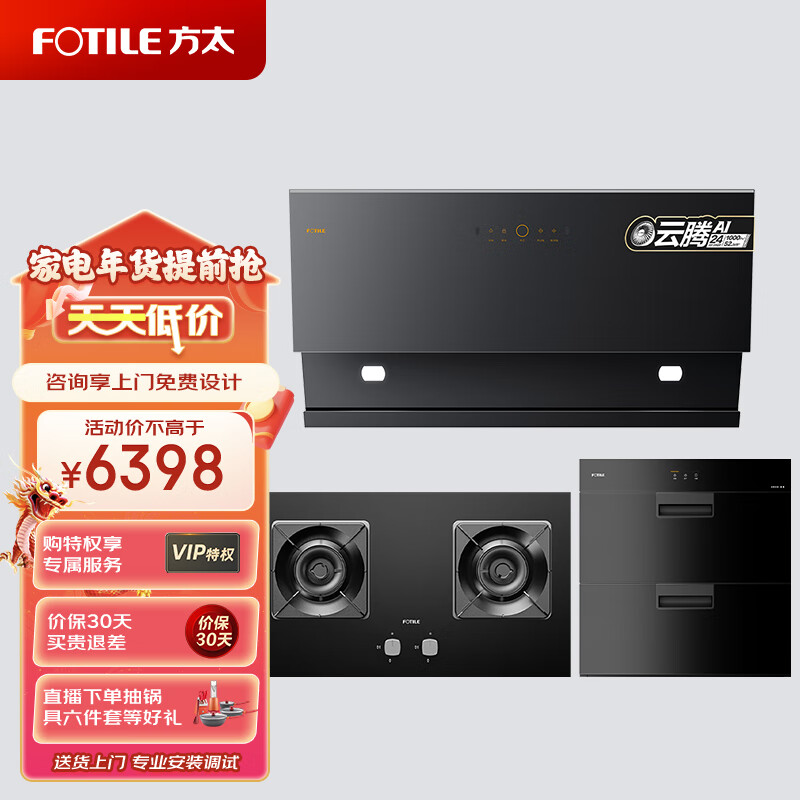 方太(FOTILE)烟灶消三件套 24风量智控直流变频烟机 5kW天然气灶 家用大容量嵌入式消毒柜JCD16T+TH27B+J51E价格:6398.00元!