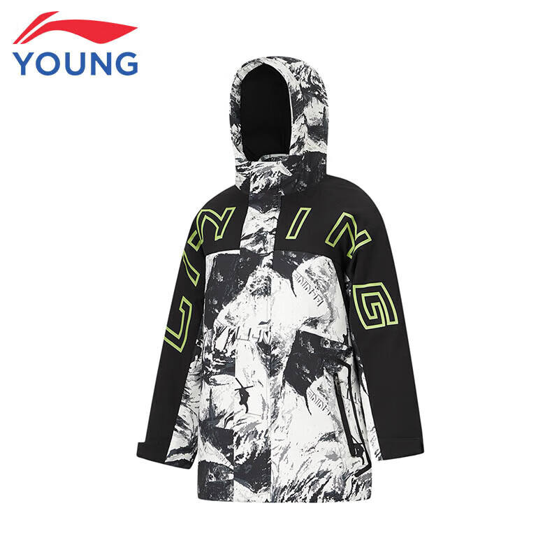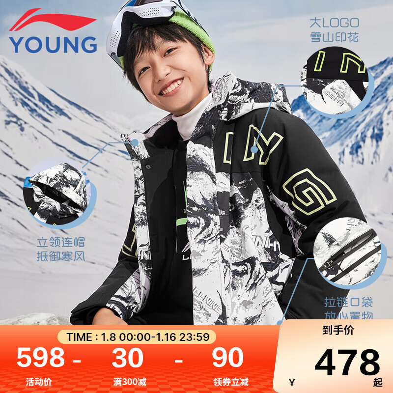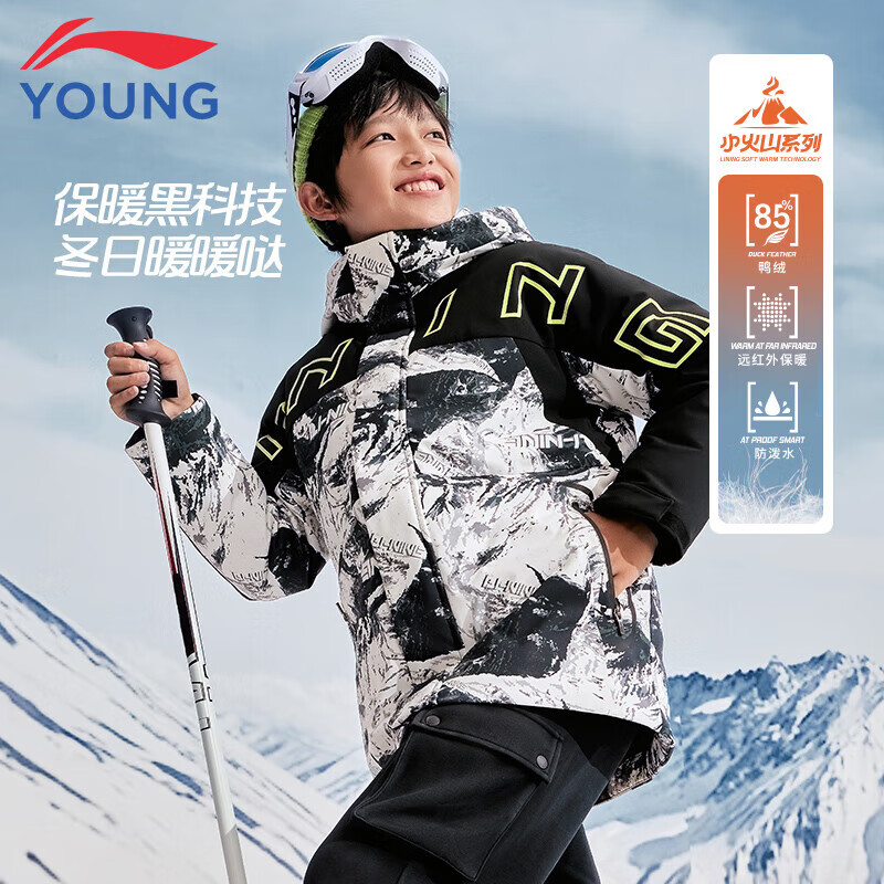 YS李宁童装儿童羽绒服男小大童运动生活连帽保暖85%鸭绒中款羽绒服YYMT175-1黑白调印花160价格:598.00元!