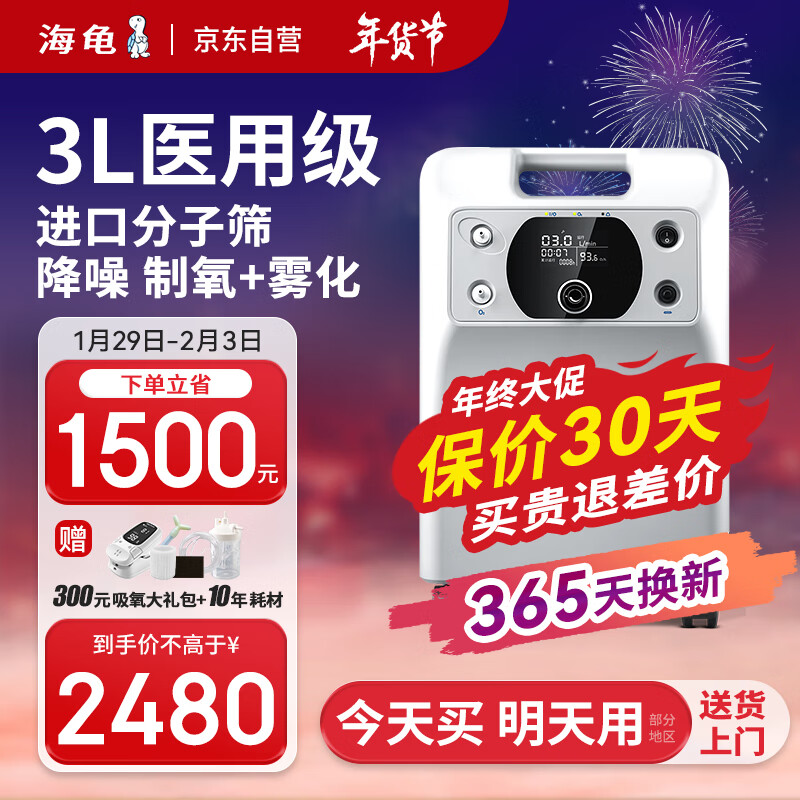海龟医用制氧机3升医用级VH3-ND高氧浓度老人孕妇3L吸氧机带雾化氧浓度实时显示价格:3980.00元!