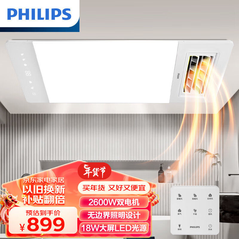 飞利浦(PHILIPS)M3浴霸2600W双核暖风排气扇照明一体 集成吊顶卫生间浴室暖风机价格:1049.00元!