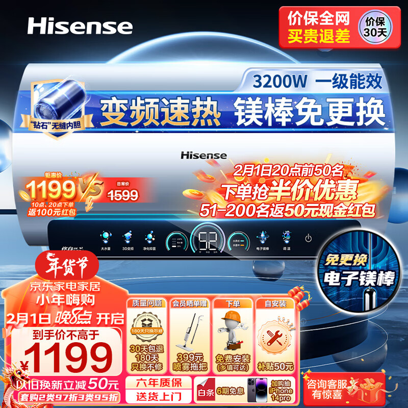 海信(Hisense)60升家用电热水器 3200W变频速热 一级能效 镁棒免更换 钻石无缝内胆 大屏C509i智享 以旧换新价格:1399.00元!