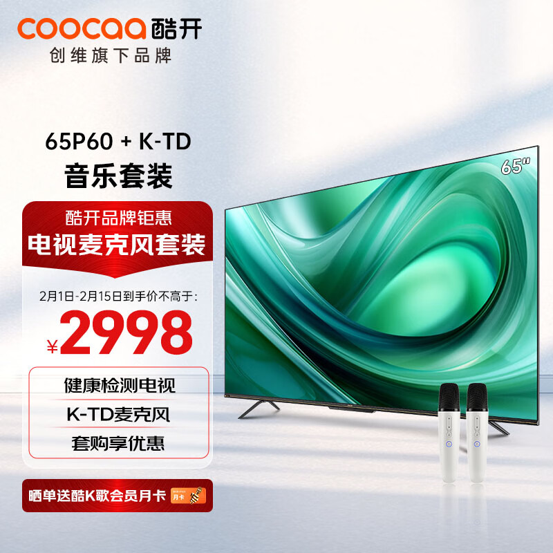 酷开创维 65英寸健康检测电视机P60+K-TD麦克风套装 K歌电视 家庭KTV无线降噪话筒唱歌会议 双支麦克风价格:2998.00元!