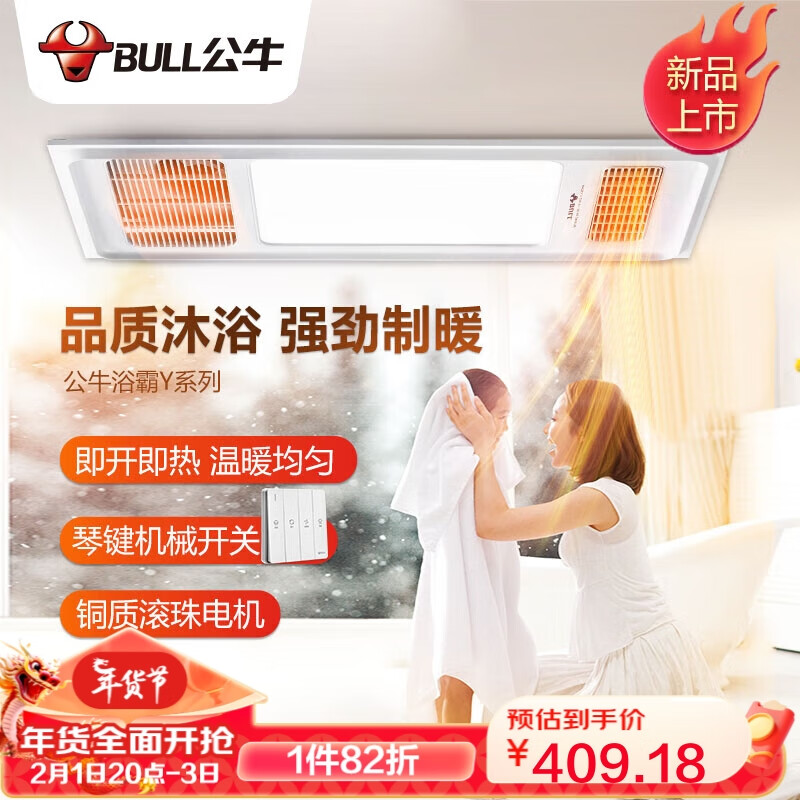 公牛(BULL)浴霸风暖浴室卫生间GY08AJT集成吊顶【取暖+吹风+换气+照明】价格:499.00元!