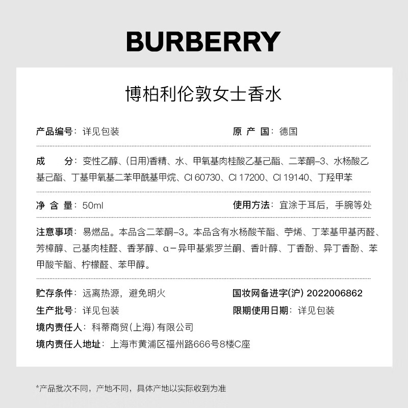 博柏利(BURBERRY)伦敦女士香水 50ml(女士浓香氛) 新年情人节生日礼物送女友老婆价格:589.00元!