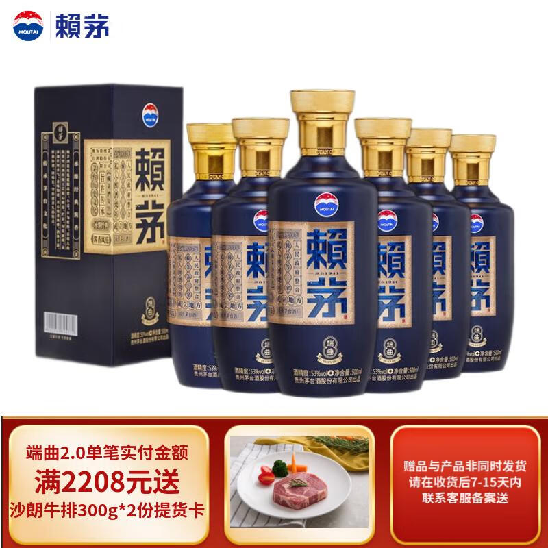赖茅茅台 端曲2.0 酱香型白酒 53度 500ml*6瓶 整箱装 商务送礼价格:2400.00元!
