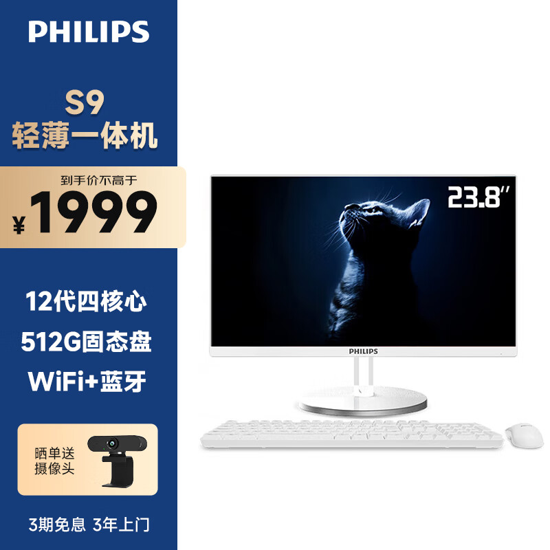 飞利浦S9 23.8英寸台式一体机电脑 家用学习办公收银主机(12代4核N95 8G 512GSSD WiFi 无线键鼠)白色价格:1999.00元!