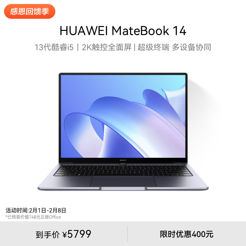 华为MateBook 14笔记本电脑 13代酷睿/2K触控屏/14英寸轻薄办公本/超级终端 i5 32G 1T 深空灰价格:5799.00元!