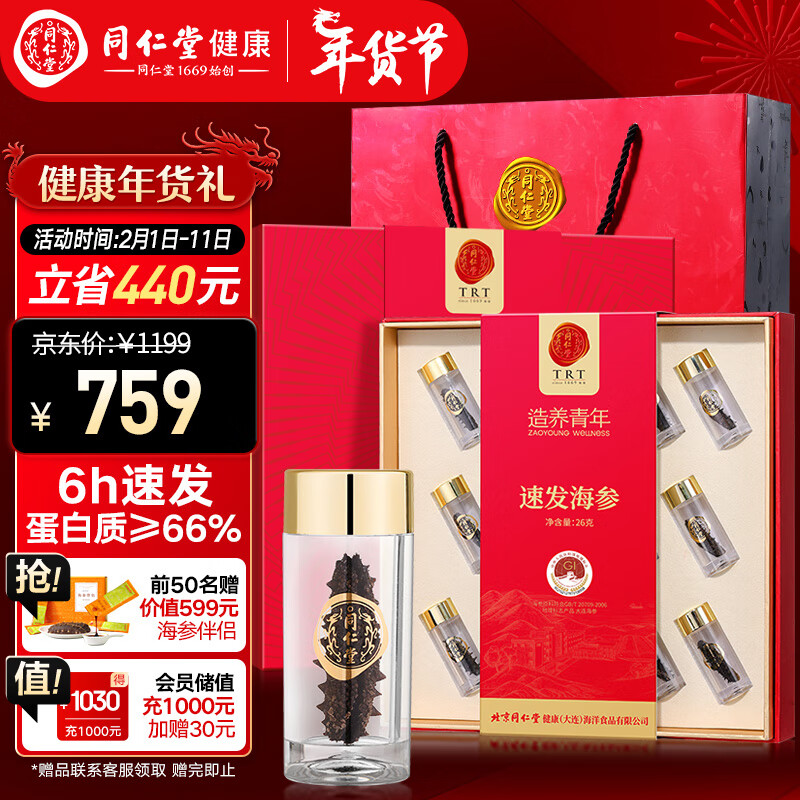 同仁堂(TRT)北京同仁堂速发淡干海参辽参26g14只海参干货 过年礼盒含盐量≤3%价格:759.00元!